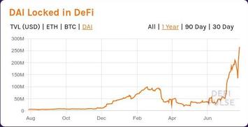 В целом принципиальная картина не изменилась: график ETH показывает всё тот же вялый интерес к DeFi; "капитализация" DeFi в долларах вплотную приблизилась к февральскому максимуму - благодаря вертолётным деньгам центро-банков на начало июня курс ETH/USD скорректировался на 80% относительно мартовского завала. Но вместе с тем на графике DAI хорошо заметен всплеск - будущий новый лидер DeFi-сектора, сервис Compaund, использует более широкий набор залоговых инструментов в сравнении с MakerDAO. И поначалу одним из основных залогововых инструментов Compaund-а помимо ETH был именно фантик DAI.
